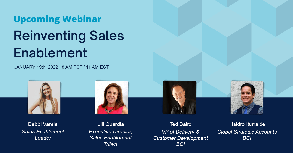 Ted Baird, BCIs VP of Delivery and Customer Development will moderate the esteemed panel. Joining us on the panel is Jill Guardia, the Executive Director, Sales Enablement at TriNet, Debbi Varela, the Director of Revenue Enablement at Procore, and Isidro Iturralde, Global Strategic Accounts Manager for BCI. Sign up today to reserve your spot.